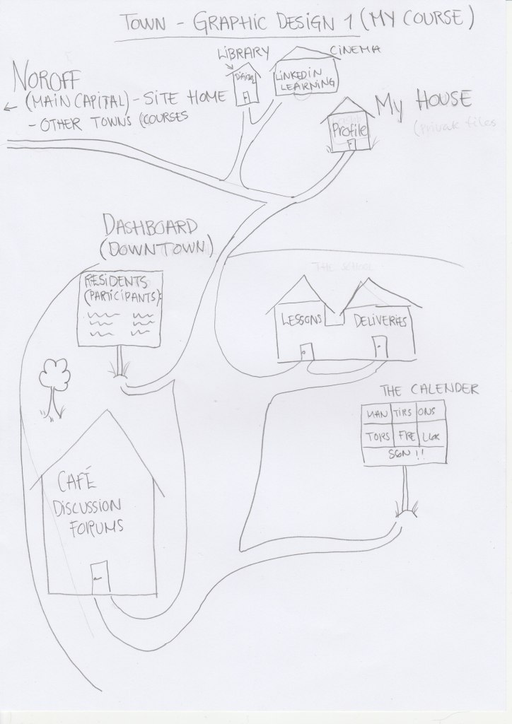 The last drawing in the cartoon is an image of «the town – Graphic Design 1», which is how I see the different elements in Moodle. I wanted to make it simple and included the elements I see as most important to me now. I also made it a little funny, for example LinkedIn Learning is the cinema, since it is a site with videos. The cafe in the town is called «Discussion Forums», I visualized the Forums like a cafe where a lot of people meet. My house in the town is My profile, and so on.