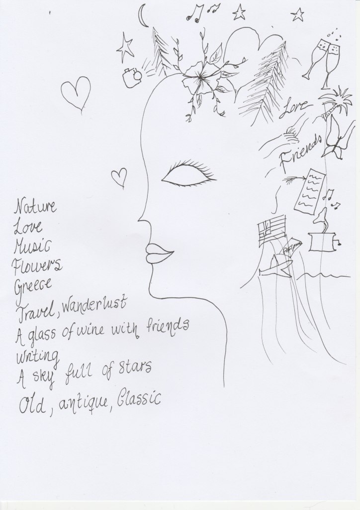 To show «who I am» I thought that I should include things that I love. I started to write down keywords of things that I really love and drew a drawing of me, then I included all the words also as drawings.