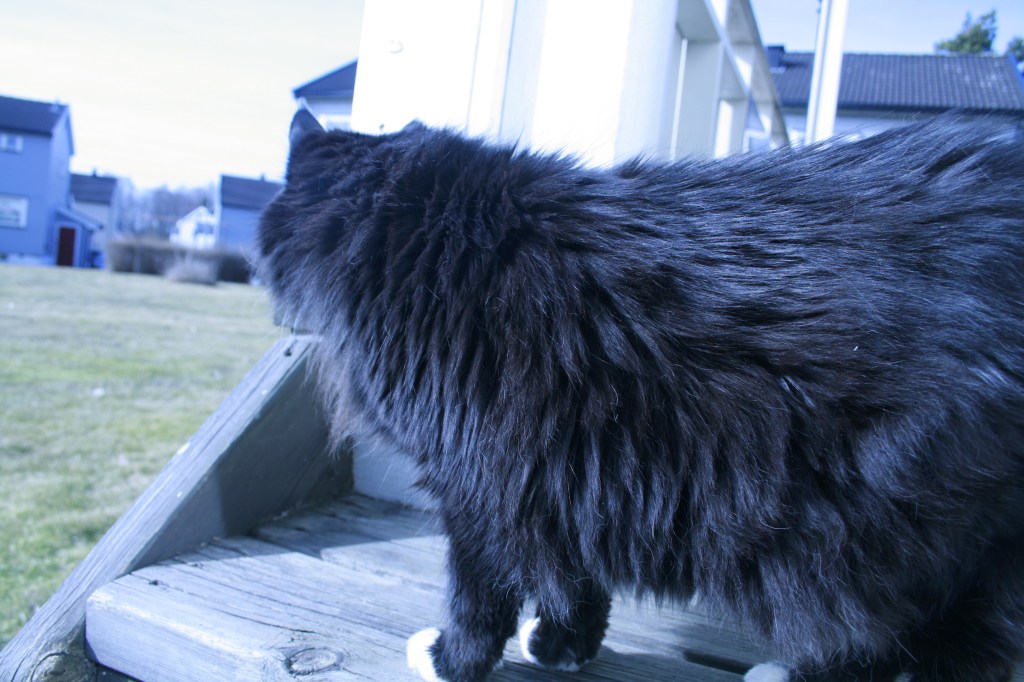 The first one is taken with white-balance setting: Daylight – 5200k. It has a more warming effect to it, and the colors «pop» more. You can see the brown color in my cat’s fur and the grass is more green.